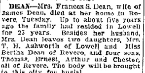 The Lowell Sun, Thurs, 18 Apr 1918, Obituary for Frances S. Smith Dean