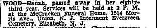 Newspaper obituary for Hannah Wood, 1952; New York Times, 6 February 1952, p. 29